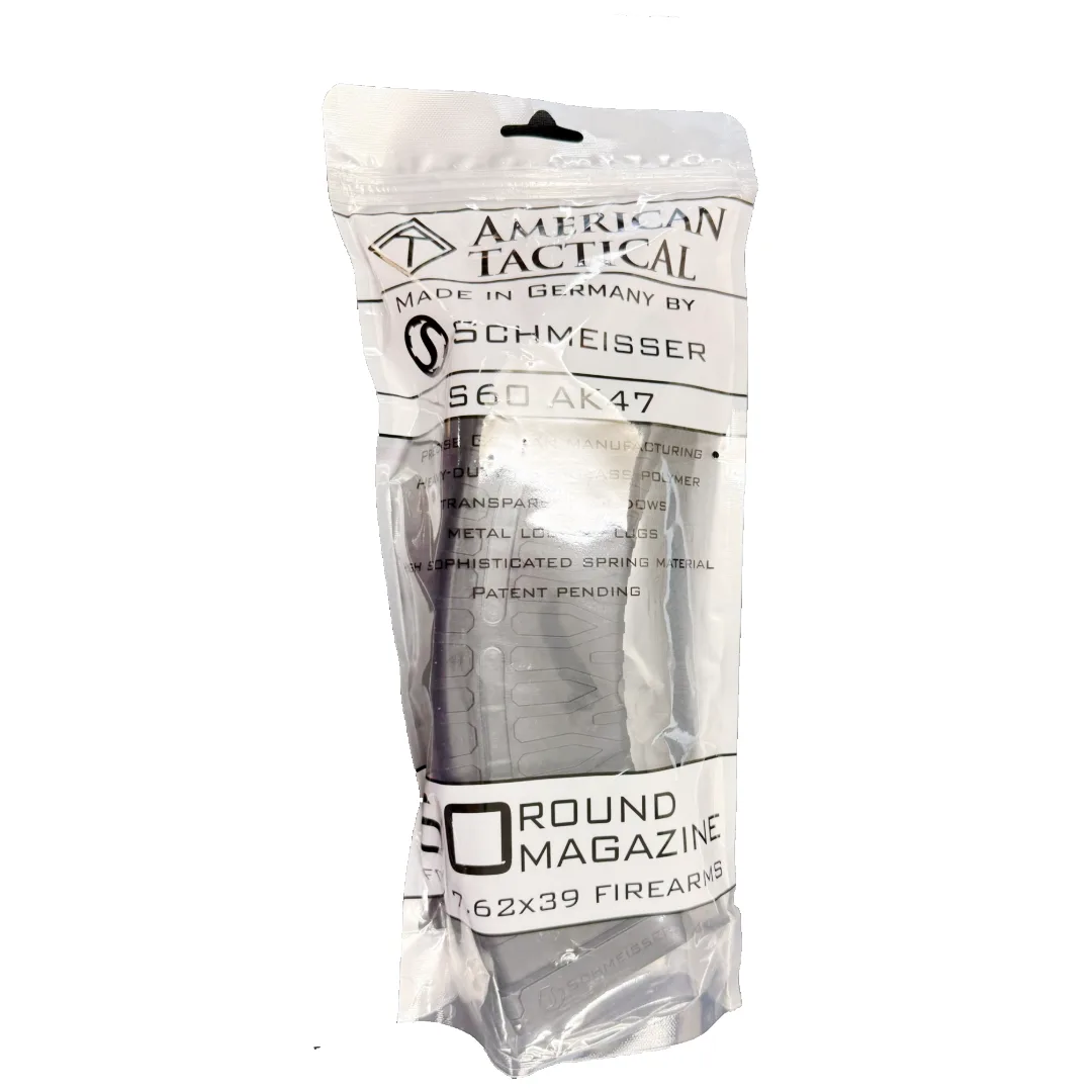Maximize your firepower with the AK-47 60-round high-capacity magazine by Schmeisser, imported exclusively by American Tactical (ATI). Built for AK-pattern rifles chambered in 7.62×39mm, this magazine offers double the ammo capacity without the bulk of a drum mag — all while staying lightweight and battle-ready.